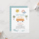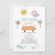 This cute "baby on board" boy baby shower invitation features a smiling sun, a rainbow with clouds, a surfboard on an orange van/camper, palm trees, and a mum and baby whale in blue waves. The reverse side features a light turquoise blue background with white wave patterns. Personalise it for your needs. You can find matching products at my store.