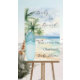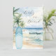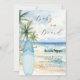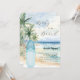 An elegant invitation for a Baby Shower, celebrating a baby boy. A watercolored sandy beach, ocean waves and palm trees as background, and a blue surfboard on the beach.