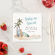 Cute surfing-themed baby shower napkins featuring a watercolor illustration of a tropical beach scene with palm trees, sandy shores, starfish and surfboards, and "Baby on Board" showcased in a fun retro blue script. Personalise the mother's name and baby shower date in simple lettering.