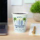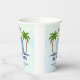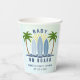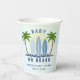 Baby on board surfing splash blue baby boy shower paper cup. Celebrate the arrival of a little surfer with this baby shower design. A gentle blue background evokes a calming ocean breeze, while three surfboards in soothing shades of blue stand proudly. Towering palm trees and golden sunrays add a touch of tropical charm, while a refreshing splash of aqua blue water brings the ocean to life. This design is the perfect way to welcome a baby boy and set the stage for a fun and festive celebration.