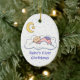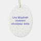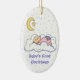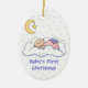 Sweet baby girl's first Christmas ornament made out of a oval shaped ceramic with a pretty ribbon. Graphics of a blue polka dot background and a sleeping baby, on a cloud, with crescent moon above, and customisable pink text reading, Baby's First Christmas. On the backside of the ornament is blue polka dot, with pink text reading name and date. Personalise all the text for your baby's first Christmas or as a lovely gift.