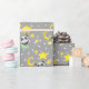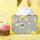 Cute baby panda with a bright yellow moon and stars on a polka dot background.