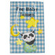 Cute baby panda with a bright yellow moon and stars on a blue gingham pattern.