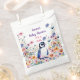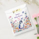 A cute baby penguin surrounded by pink, blue, orange and purple flowers watercolor illustration girl's baby shower personalised treat favour bags.