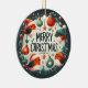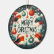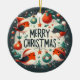 A festive and playful Christmas illustration featuring four cheerful robins, each wearing either a Santa hat or a winter beanie. Surrounding the birds are holiday decorations such as ornaments, holly, stars, and snowflakes, all arranged in a circular composition. In the centre, the words "Merry Christmas" are displayed in bold, whimsical lettering. The design uses a vibrant colour palette of orange, green, red, and white, set against a dark background, evoking a joyful holiday spirit.