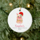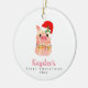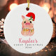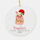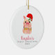Baby Pig First Christmas Custom Ceramic Ornament — The precious personalised xmas ornament template features an adorable watercolor piglet and piggy is wearing a santa hat and a tangled in holiday lights. The text boxes allow for easy customisation of a baby's name in a handwritten bold pink calligraphy script font, and birth year in a simple, minimalist sans serif. Both sides of this personalizable keepsake tree decoration are identical.