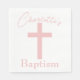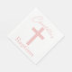 These Baptism celebration napkins feature a white background with a soft, baby pink coloured cross in the centre. A sample baby girl name is printed at the the top of the napkin, and the word "Baptism" is printed at the bottom in matching pink font. You can personalise it to include your own custom name or message.
