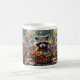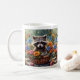 A ceramic mug featuring an illustration of a baby racoon in a basket of flowers