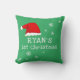 Baby`s First Christmas Green Santa Hat Snowflakes Baby pillow. Cute baby first Christmas design with a Santa hat, snowflakes and a baby name in a white script - personalise with your baby`s name.