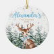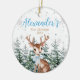 Celebrate your little one’s first holiday season with this adorable personalized Christmas ornament. The design features a sweet watercolor reindeer wearing a blue bow, surrounded by snowy pine trees and delicate silver snowflakes. This design features your child’s name easily customizable for a personal touch. Perfect for hanging on the tree or gifting to new parents, this ornament adds a charming woodland touch to any Christmas décor.