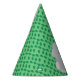 This party hat features a repeating pattern of green jungle leaves over a lighter green background and clipart of a cute grey baby elephant on the front.