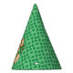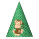 This party hat features a repeating pattern of green jungle leaves over a lighter green background and clipart of a cute brown and tan baby monkey on the front.