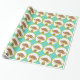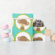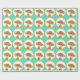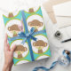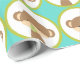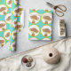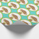 Wrapping paper with a repeating pattern of a cute baby monkey with a pacifier in his mouth Inside an olive green circle. Set on a greenish blue background.