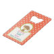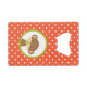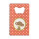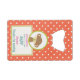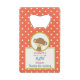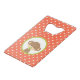 Baby shower bottle opener. Designed with a cute baby monkey holding a pacifier in his mouth inside a circle with an olive green border. The background is an orange and white polka dot pattern. The letters in the word baby are hanging down from a boho style arrow. Text says thank you and is ready to be customised with your guest of honour's name.