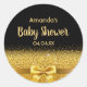An elegant and glamourous gender neutral baby shower sticker. Classic black and golden sparkle background with a faux gold ribbon and bow. Template for the mum to be's name, the date of the baby shower and the text: Baby Shower. Golden letters.