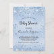 For a baby shower, celebrating a baby boy. A light blue faux metallic looking background. Decorated with faux glitter dust. Templates for the mum to-be's name and party details. The name and the text: Baby Shower are written with a hand lettered style script