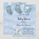 For a baby shower, celebrating a baby boy. A blue faux metallic looking background. Decorated with blue faux glitter drips, paint dripping look, balloons and a cute little baby elephant boy. Personalise and add the name of the mum to-be's name and party details. The name and the text: Baby Shower are written with a hand lettered style script