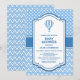 Invite your friends and loved ones with this blue and white hot air balloon baby shower invitation which is decorated with polka dots and chevron stripes.