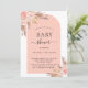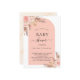 For a modern boho baby shower. An arch frame, white and rose gold colored background. Decorated with rose gold and pink florals, roses and pampas grass. Personalize and add a name and details.