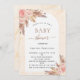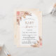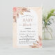 For a modern boho baby shower. An arch frame and rose gold marble print as background. Decorated with rose gold and pink florals, roses and pampas grass. Personalise and add a name and details.