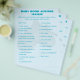 A game your guests are sure to enjoy! Match the titles of popular children's books with the correct author. Design front features a pale blue background to the image of dainty crocheted baby booties. Heading is featured in a bold ocean blue font. Game directions are displayed below heading in a clear, easy-to-read print. Option to use the provided authors and titles or customize your own! Answers to the game are as follows: