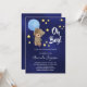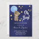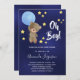 For a baby shower celebrating a baby boy. A navy blue background, and yellow stars. The blue colour is uneven. A teddy bear holding a light blue balloon. Personalise and add the name of the mum to-be and party details. The name and the text: Oh Boy! are written with a hand lettered style script