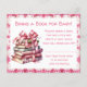 A cute insert to put in the baby shower invitation. Bring a book for Baby card with a cute bundle of books graphic and a pink crocheted teddy bear and blanket baby blanket background.