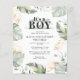 Wild, calm, and elegant boys safari animal baby shower invitation featuring a giraffe, gold effect and green leaves. Perfect for boys baby shower budget invitations