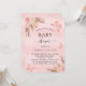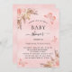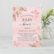 For a modern boho style baby shower. A blush pink rustic faux metallic looking background. Decorated with rose gold and pink florals, roses, pampas grass and butterflies. Personalise and add a name and party details.