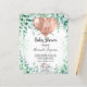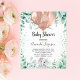 For a baby shower, celebrating a baby girl. A white background. Decorated with rose gold balloons, a cute little baby elephant girl and eucalyptus greenery and green sparkles. Personalise and add the name of the mum to-be's name and party details. The name and the text: Baby Shower are written with a hand lettered style script