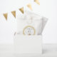 Gold Black Stars, Baby Shower, favour bags, with adorable baby playing amongst gold and black swirls and stars background. Personalise text by deleting "Thank You! Love, Emma" and adding your own. Customise by choosing your favourite font size, colour, and style. Choose from three colour bags, white, ecru and kraft. Paper bag is 8"1 x 5" wide.