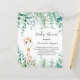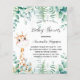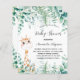 For a baby shower, gender neutral. A white background. A cute little baby giraffe and eucalyptus greenery and woodland ferns. Personalise and add the name of the mum to-be's name and party details. The name and the text: Baby Shower are written with a hand lettered style script