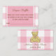The back of these cute baby shower raffle tickets feature a sweet girl teddy bear wearing a pink bow. Personalise the details for your baby shower diaper raffle on the front and back. Background has a pink buffalo check pattern.