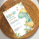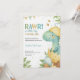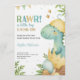 Baby shower invitation featuring a cheerful dinosaur hatching from an egg, surrounded by green leaves. "RAWR! A little boy is hatching soon!" with details below. The background is light with playful, vibrant tones.