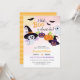 Baby shower invitation for Little Boo Halloween party with cute pumpkins, ghost and bats.