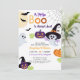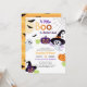 Baby shower invitation for Little Boo Halloween party with cute pumpkins, ghost and bats.
