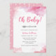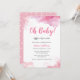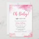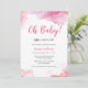 Baby Shower invitation with hand lettered heading and pretty pink watercolours and a decorative arrow and heart patterned back page.