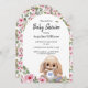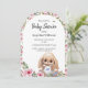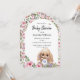 Flat lay baby shower invitation card with adorable watercolor roses and cute stuffed bunny.