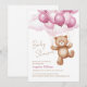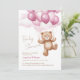 A baby shower invitation decorated with an adorable teddy bear riding balloons in the clouds.