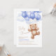 A baby shower invitation decorated with an adorable teddy bear riding balloons in the clouds.