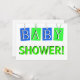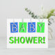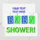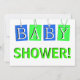 Four hanging gift tags in blue and green spell out the word "BABY" in white 3d letters makes a cute invitation in pretty pastel colours. The word "SHOWER!" is in light green just below the tags. The clean white background colour can easily be changed. Just click on customise, and then click on "colours" to change it. Easily put your information on the back on the same white background with blue text which can also be easily changed. A cute an unique custom baby shower invitation. Matching postage stamp and postcard in the MVDesigns store.