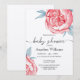 Baby shower invitations feature adorable watercolor flowers in soft pink with emerald leaves.