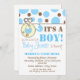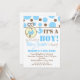 A baby shower invitation featuring a top border of blue and brown polka dots. Blue diaper pin attached to top border and circle shape with blue baby carriage inside. Personalise the blue and brown text with details of your occasion.