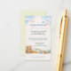 The soft pastel design includes clouds, stars, a moon, birds, a teddy bear, and whimsical baby items like bottles, shoes, and a hedgehog toy. This dreamy theme blends charm with functionality, perfect for rustic, whimsical, or pastel-inspired baby showers. With customisable details for date, time, and location, this card ensures every guest feels part of the celebration.