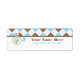 Baby shower address labels featuring a top border of blue and brown argyle with brown trim. Blue diaper pin attached to border and circle shape with blue baby carriage inside. Personalise the text with your name and address.