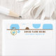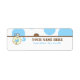 Baby shower address labels featuring a top border of blue and brown polka dots over white with brown trim. Blue diaper pin attached to border and circle shape with blue baby carriage inside. Personalise the text with your name and address.