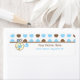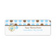 Baby shower address labels featuring a top border of blue and brown polka dots over white with brown trim. Blue diaper pin attached to border and circle shape with blue baby carriage inside. Personalise the text with your name and address.