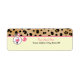 Baby shower address labels featuring a top border of leopard print with pink trim. Pink diaper pin attached to border and circle shape with pink baby carriage inside. Personalise the text with your name and address.