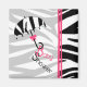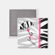 A baby shower favour magnet featuring a background of zebra print. Left side is sheer outlined in pink with an illustration of a zebra print umbrella with pink bow. Text hanging from umbrella reads "Baby Shower." Look for matching invitations at The Pink Schoolhouse.