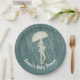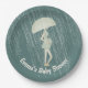 Pregnant woman with an umbrella in the rain on teal green background for a baby shower.
